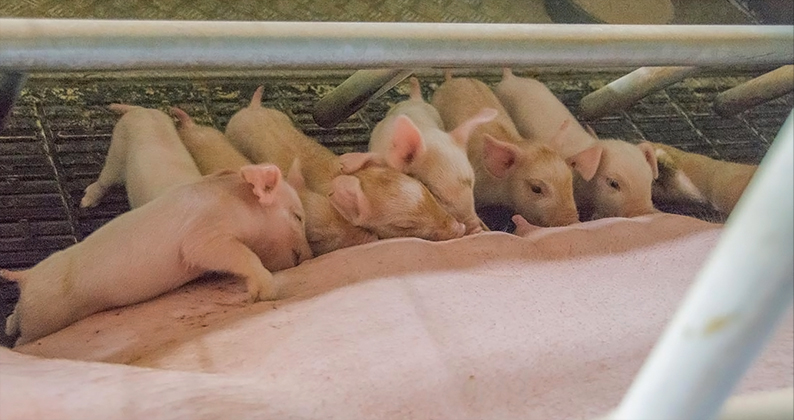分娩舎から引っ越した子豚たちが、生後77日目まで過ごします。外部の病原菌などから守るため、