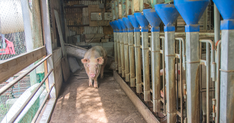78日目から出荷(180日前後)までここで過ごします。一頭あたりのスペースが広い、開放型の豚舎です。
