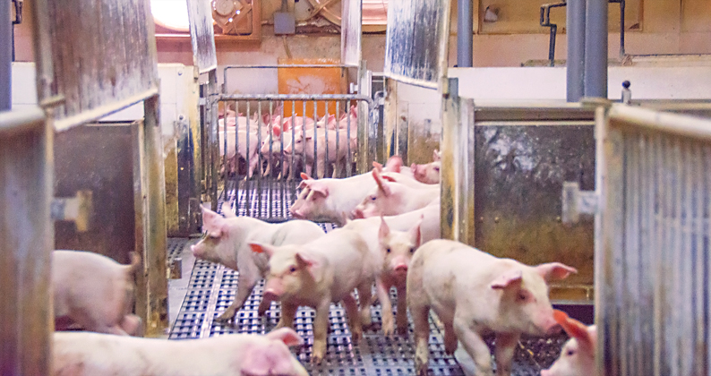 分娩舎から引っ越した子豚たちが、生後77日目まで過ごします。外部の病原菌などから守るため、